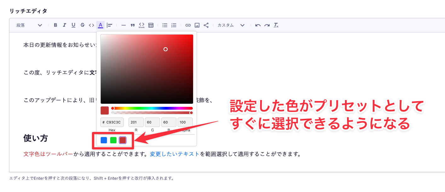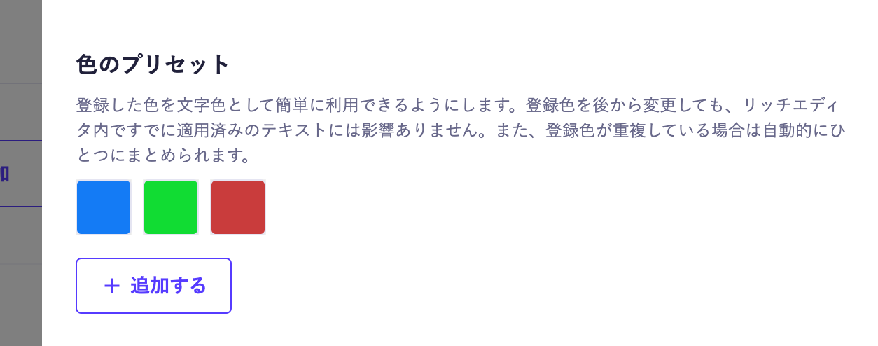 色のプリセットは、API設定画面で事前に文字色を登録して、エディタ側で簡単に使えるようにする機能です。
