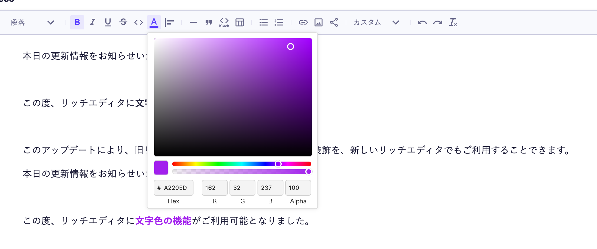 しかしながら、文字色を追加する機能については多くのご要望をいただいていたこともあり、(新)リッチエディタにも同様の機能を追加いたしました。