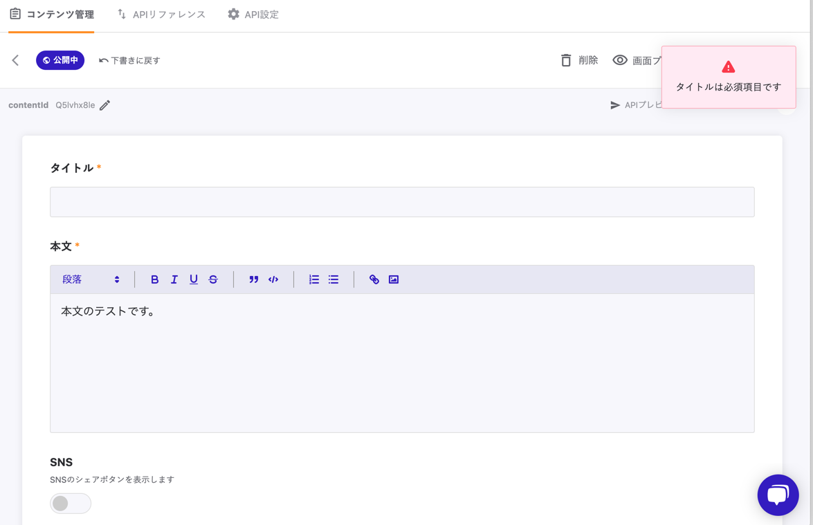 - 必須項目を空のままで公開 / 下書き保存 / 予約公開しようとするとエラーメッセージが表示される