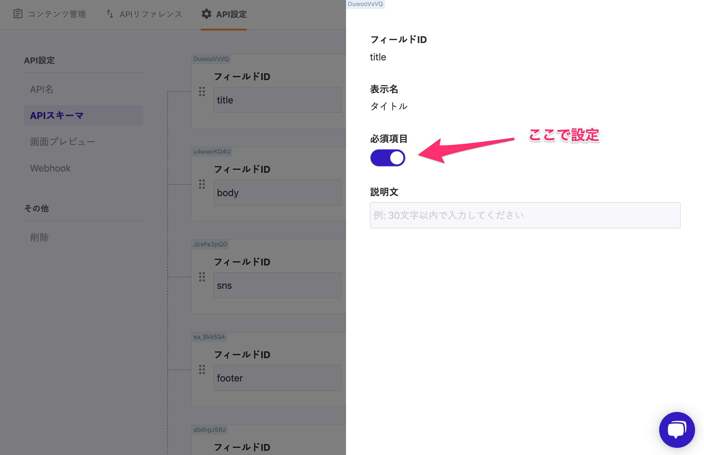 API設定 > APIスキーマ から、必須設定がしたい項目の設定アイコン⚙️をクリックします。