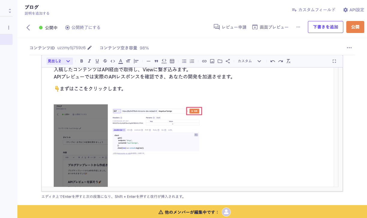 画面下部に、他メンバーがコンテンツを編集中である通知が表示されます。
