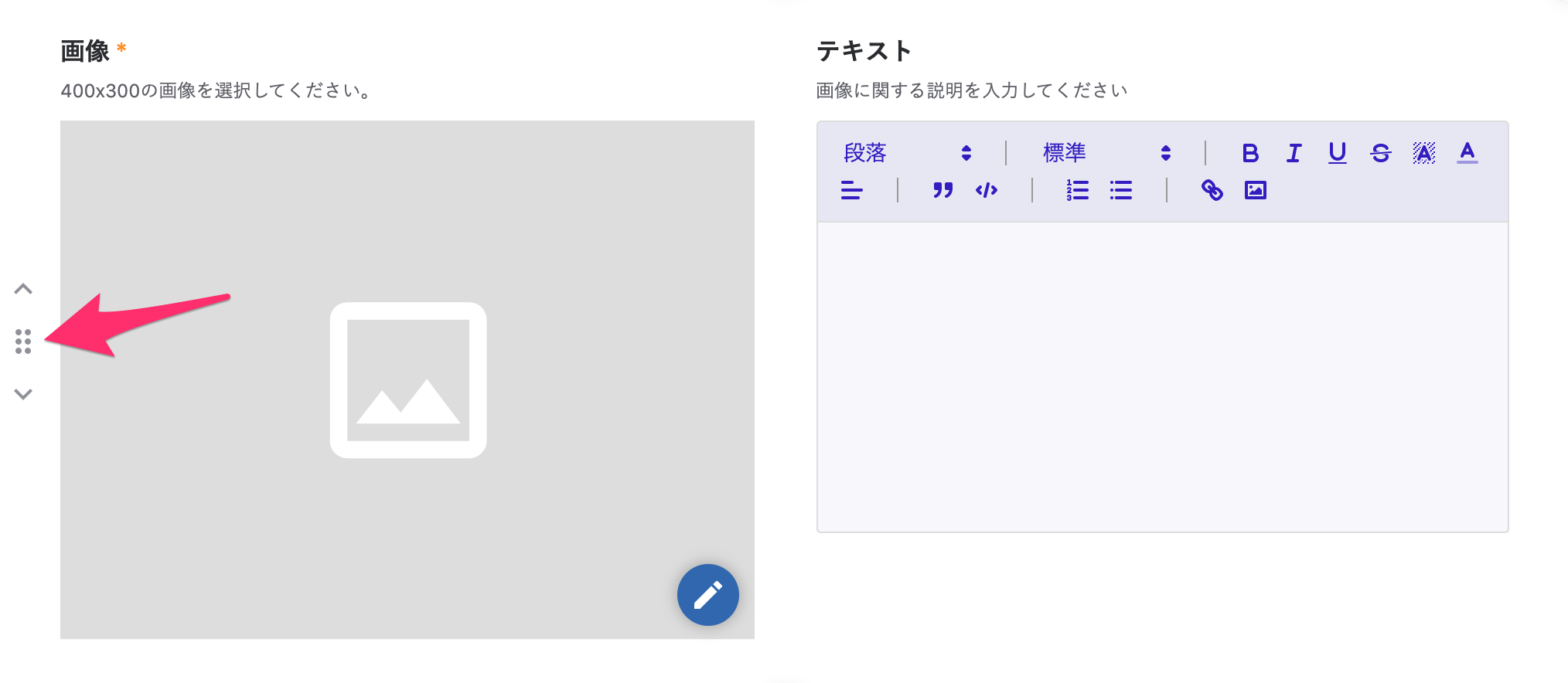 コンテンツ一覧画面と同様、ドラッグ&ドロップによる並び替えと、上下矢印クリックによる上下入れ替えが可能です。