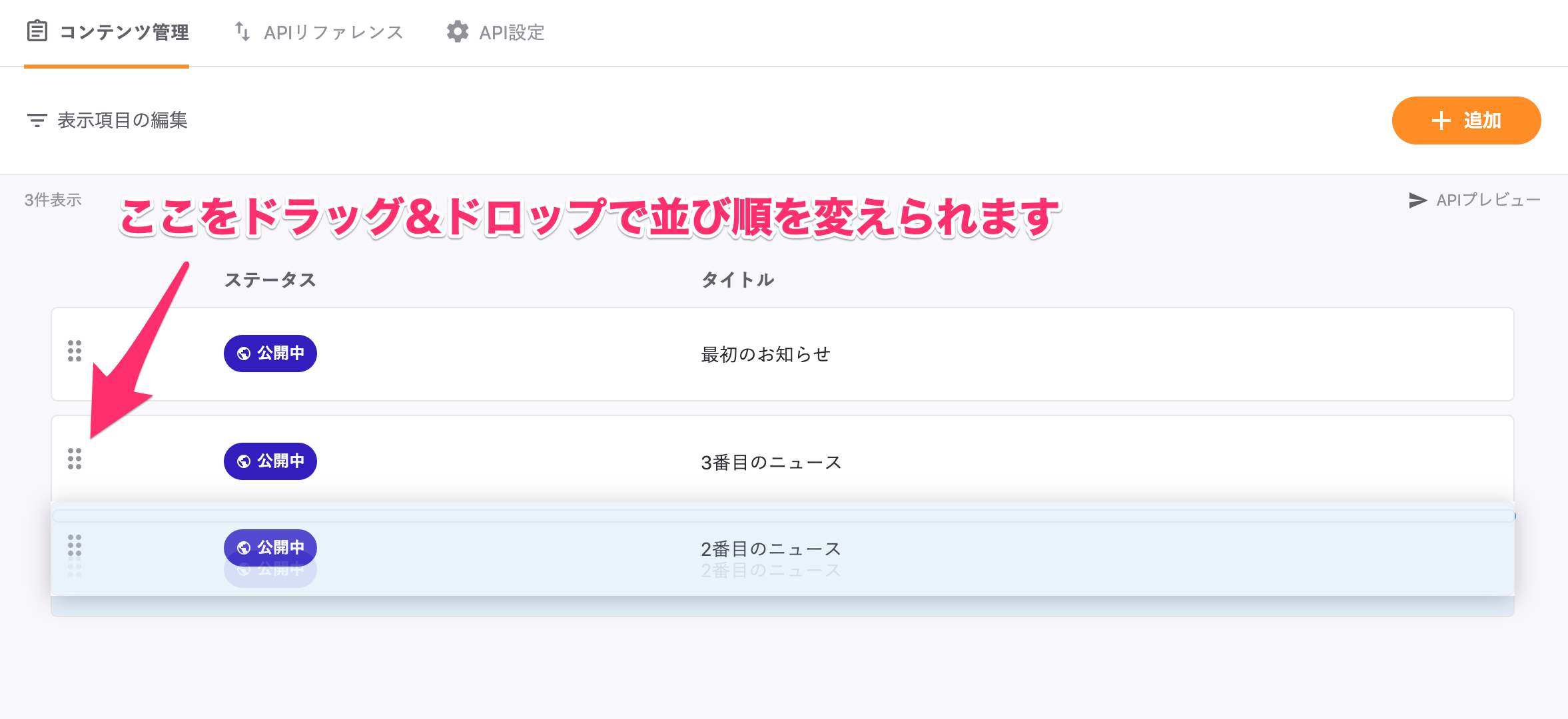 並び替えはコンテンツ管理画面の左側のアイコンをドラッグ&ドロップするとお使いいただけます。
