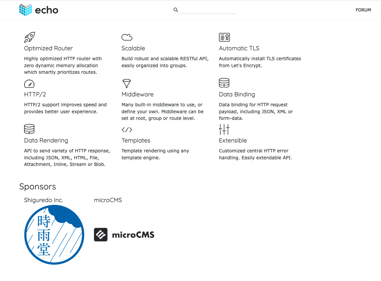 そして少し前から実際にスポンサーとなっており、現在はEchoのホームページ https://echo.labstack.com/ にも弊社ロゴが掲載されています。