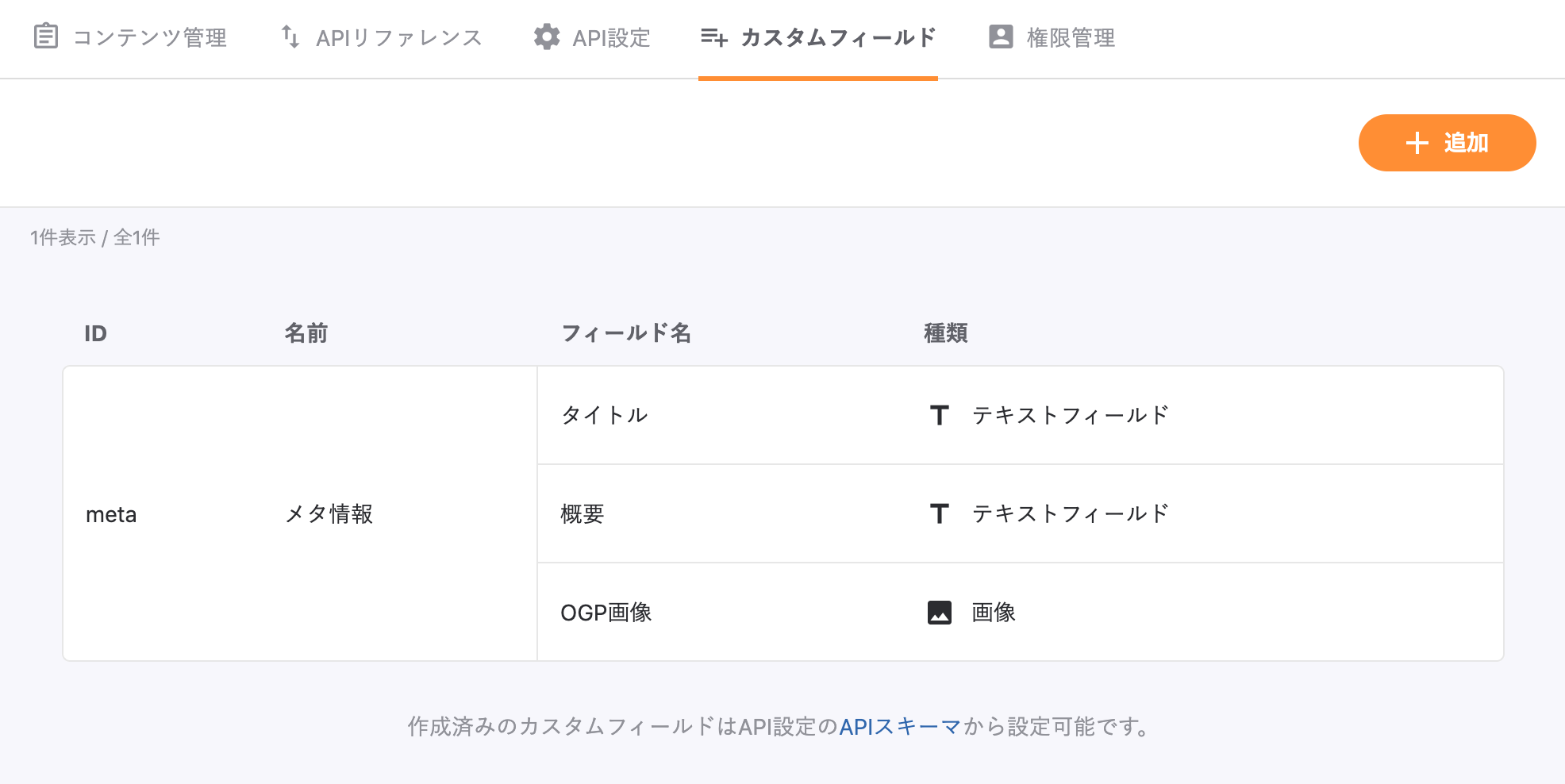 追加ボタンがあるのでクリックし、カスタムフィールドの作成画面に遷移します。