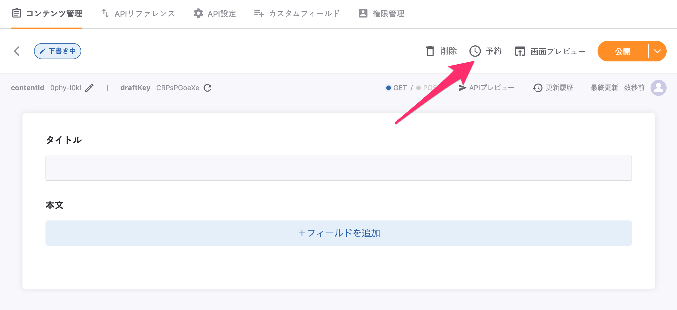 - 予約設定中でも公開ボタンを押すとコンテンツは公開され、下書きボタンを押すとコンテンツは下書きに戻ります。