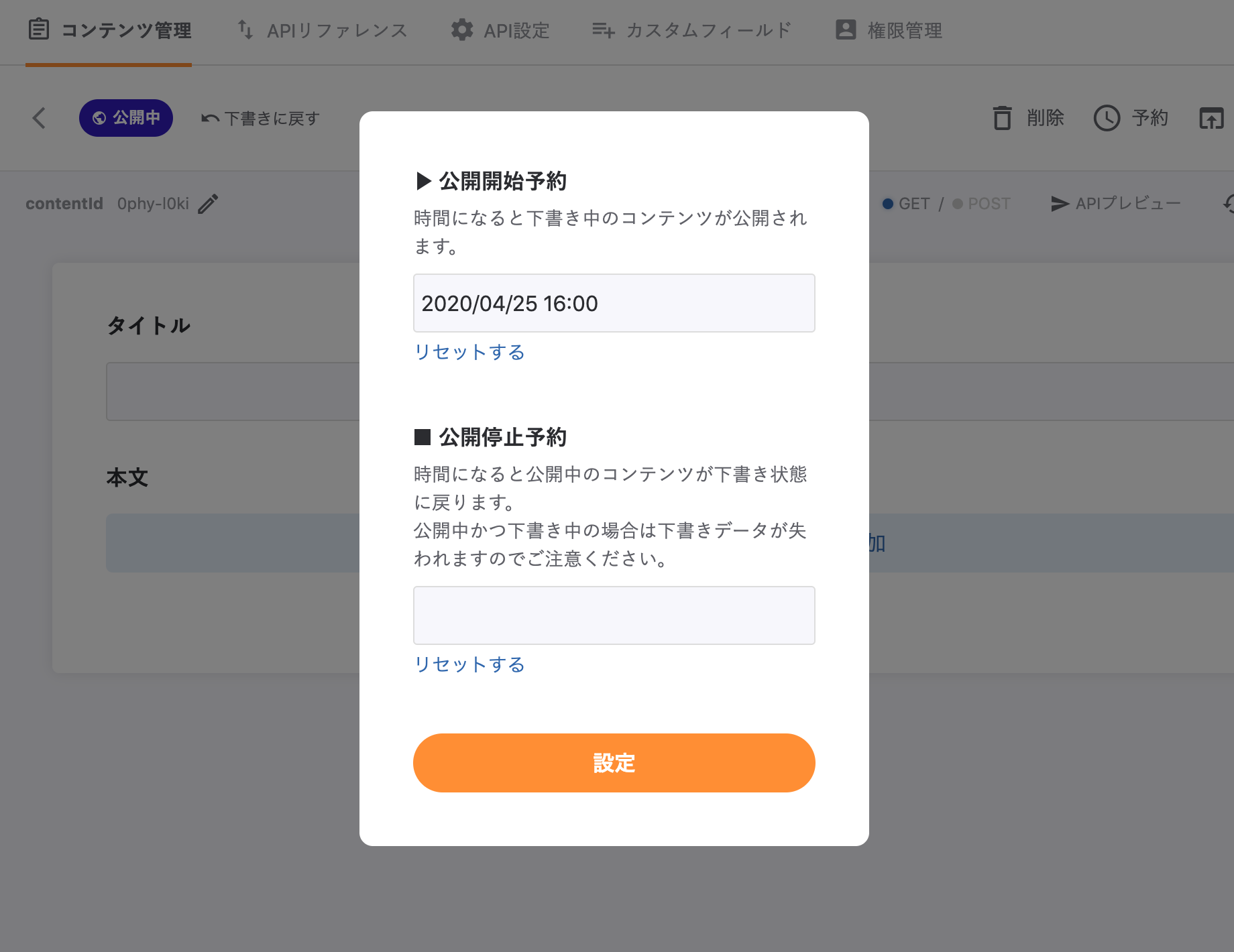 ここで公開開始と公開停止の2つの予約設定ができます。