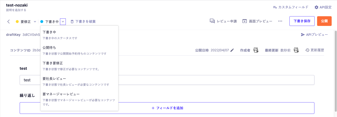 コンテンツの編集画面から、カスタムステータスを以下のように変更・管理が可能です。