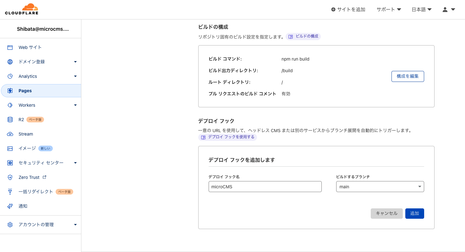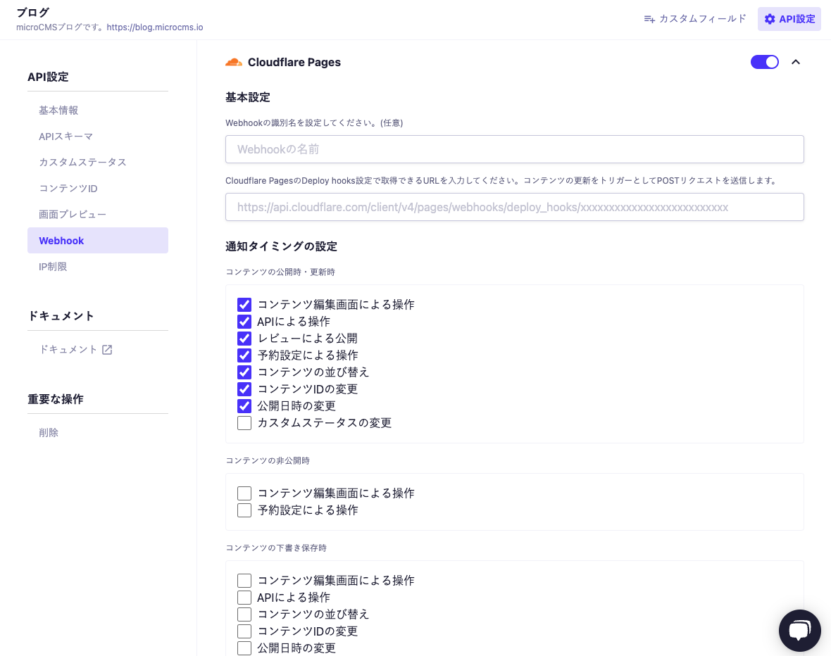次に、microCMS側の「API設定 > Webhook」より「Cloudflare Pages」を追加してください。
