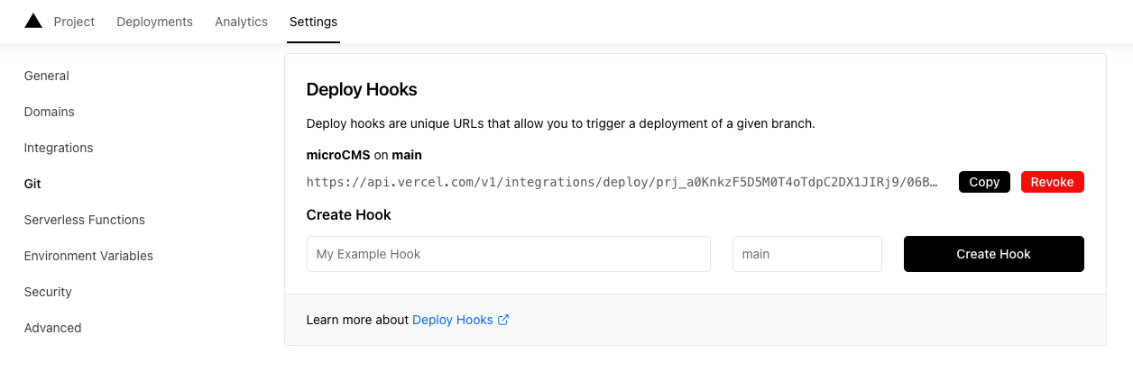 「Settings > Git > Deploy Hooks」よりデプロイフックを作成します。