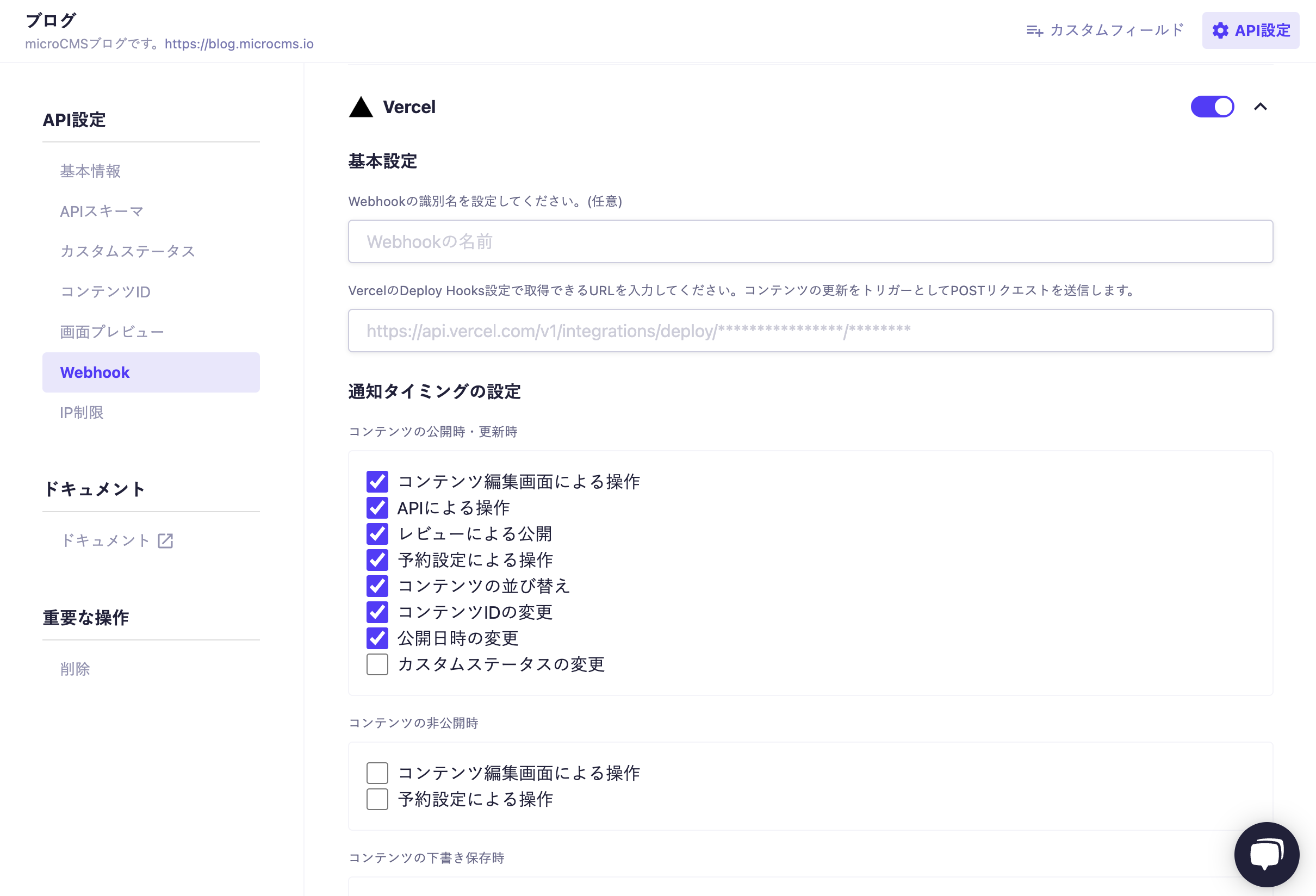 次に、microCMS側の「API設定 > Webhook」より「Vercel」を追加してください。