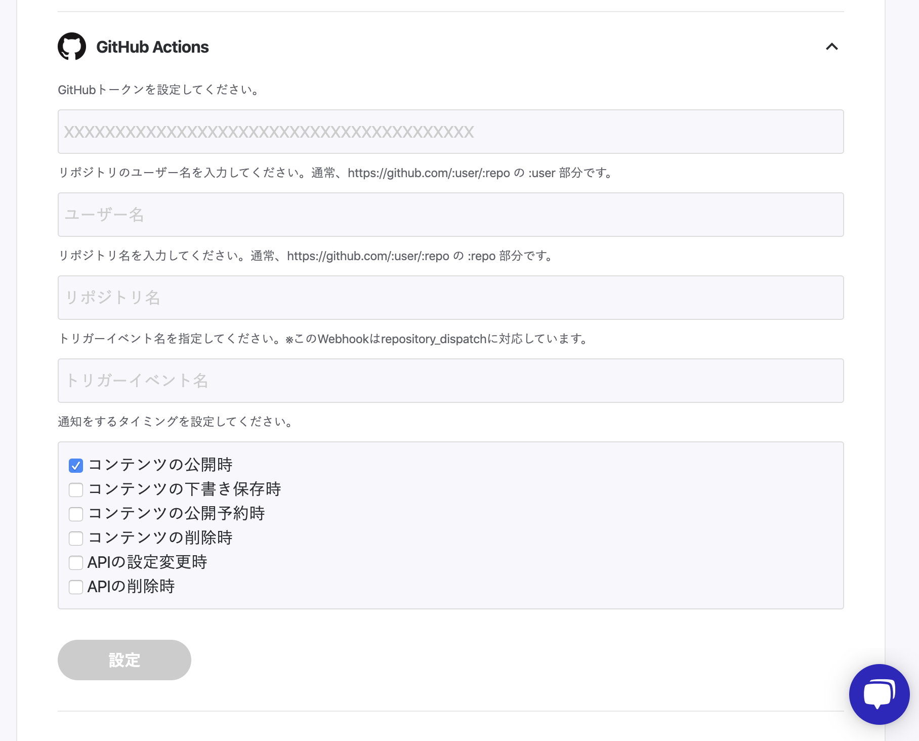 今回追加したWebhook機能はRepository Dipatchイベントに対応しており、設定を行うには以下の4つの情報が必要です。