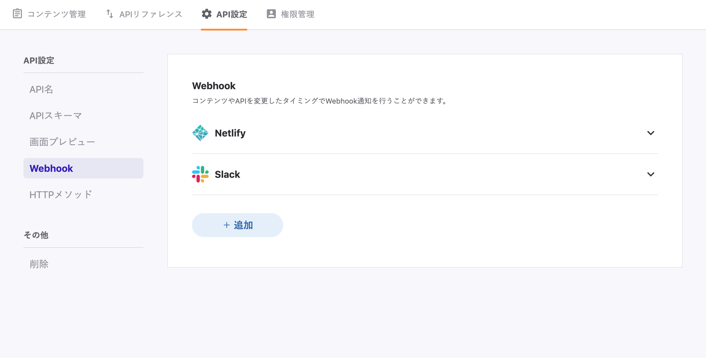 GitHub Actions連携を設定するにはまず、API設定の「Webhook」を開いてください。